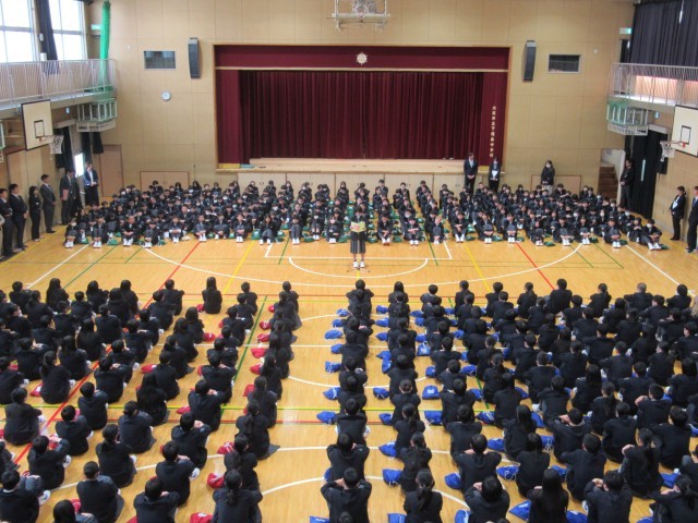 始業式後、生徒会が司会で対面式を行いました。1年生と2・3年生が対面して、在校生代表からの歓迎のことば、新入生代表からの誓いの言葉がありました。これからよろしくお願いします。