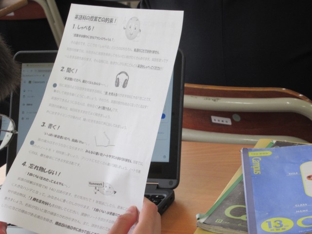 英語の授業での約束の説明。毎時間、グーグル・クラスルームに入って振り返りをすることを確認。
