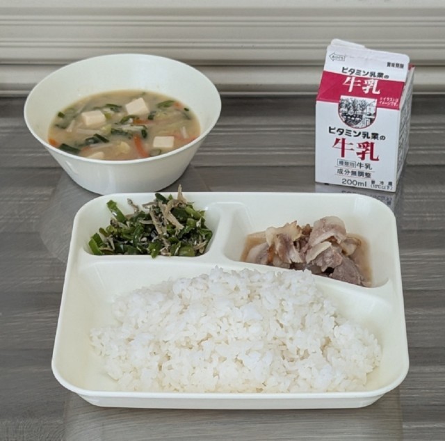 豚肉の甘辛焼き とうふのみそ汁 じゃこピーマン ごはん 牛乳
