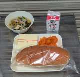 えびのチリソース 中華スープ スライスチーズ 黒糖パン 牛乳 今日もおいしく...