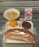 焼きハンバーグ ケチャップ 豆乳スープ みかん(冷) 黒糖パン 牛乳