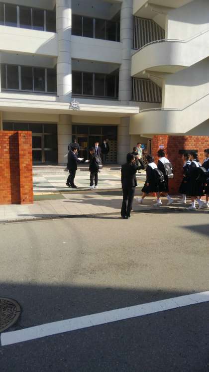 正門でクラス発表のプリントをもらっている生徒もいました。