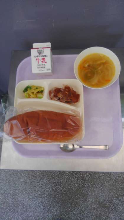 今日の献立は、豚肉のデミグラスソース、スープ、キャベツとピーマンのソテー、パンプキンパン、牛乳です。
