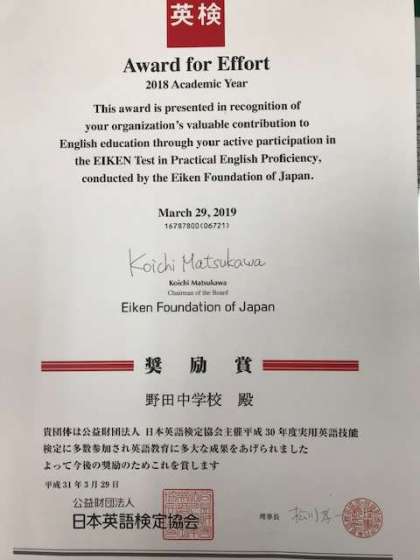 昨年度(平成30年度)に、多くの野田中生が英語検定にチャレンジしてくれた証がここに表されています。