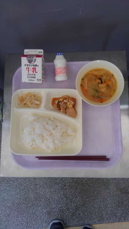 今日の献立は、焼きとり、みそ汁、もやしのゆずの香あえ、発酵乳、ごはん、牛乳です。