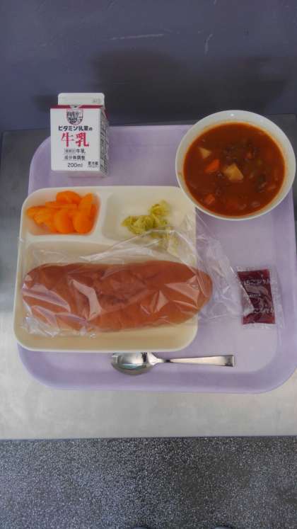 今日の献立は、ビーフシチュー、キャベツのピクルス、みかん(缶)、いちごジャム、パン、牛乳です。