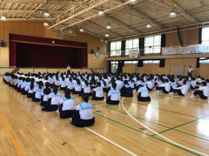 全校集会で校長先生よりお話をいただき、その後、生徒会長の岡田さんより野田中学校いじめ問題撲滅宣言がありました。