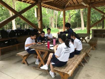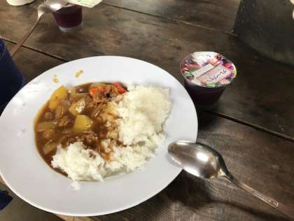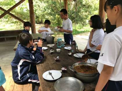 自分たちで作ったカレーに、協力という充実感を加えて美味しそうに食べています。