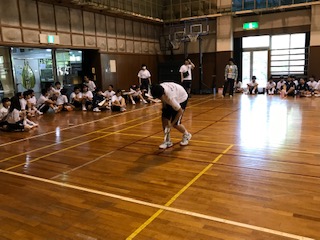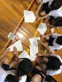 時間内に紙ヒコーキを折り、各クラスから1名が飛ばし、距離を競う競技です。