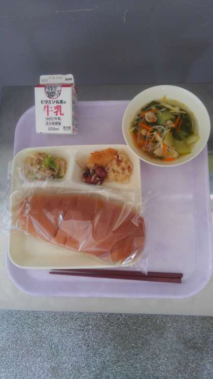 今日の献立は、金時豆の中華おこわ、中華スープ、ツナと野菜のオイスターいため、パン、牛乳です。