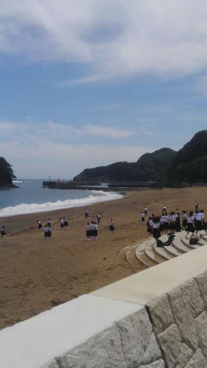 お弁当をいただき、海岸で過ごしました。時間調整しながら、学級写真を撮り、予定時間の13時45分から入村式を行います。