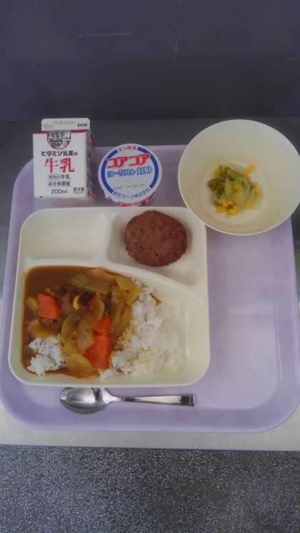 牛肉と大豆のカレーライス、焼きハンバーグ、レタスとコーンのサラダ、ヨーグルト、牛乳です。