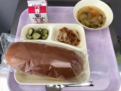 今日の献立は、黒糖パン、牛乳、じゃがいものミートグラタン、スープ、きゅうりのピクルスです。