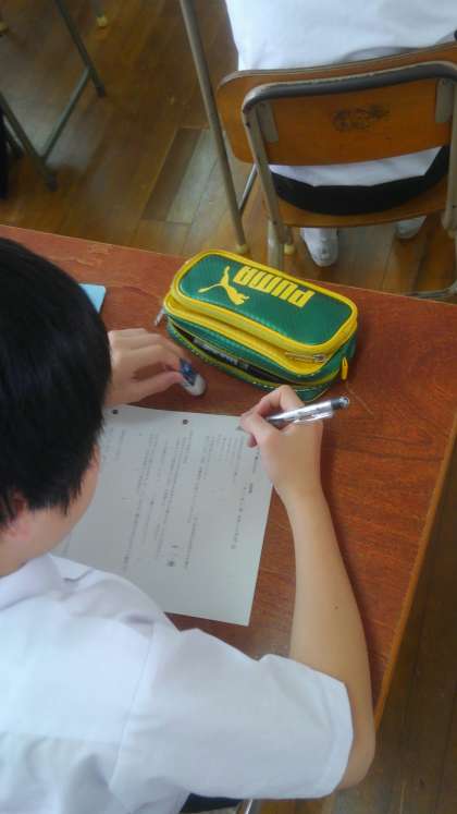 実習生は、3週間目に入って当初よりも落ち着いて授業を進めるようになりました。この時間は、ワークシートの内容を電子黒板に提示して、生徒が見やすいように工夫していました。