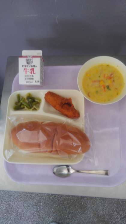 今日の献立は、サーモンフライ、豆乳スープ、キャベツとさんど豆のサラダ、黒糖パン、牛乳です。