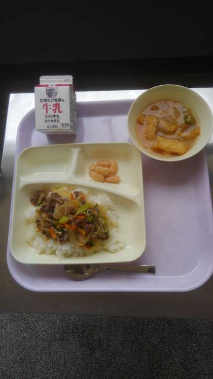 今日の献立は、牛丼、とうがんのみそ汁、大福豆の煮もの、牛乳です。
