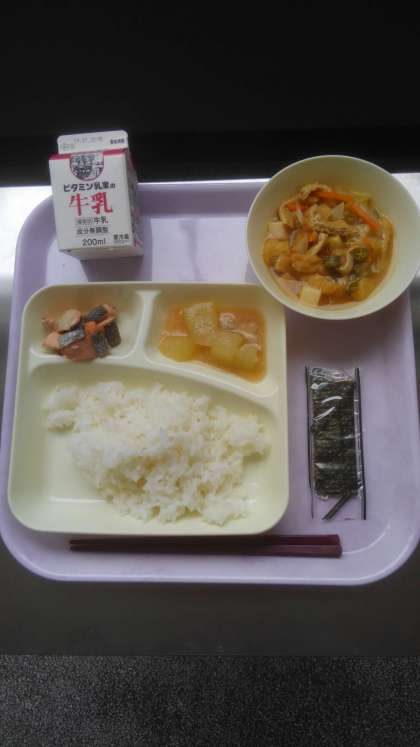 今日の献立は、さけのつけ焼き、みそ汁、とうがんの煮もの、焼きのり、ごはん、牛乳です。