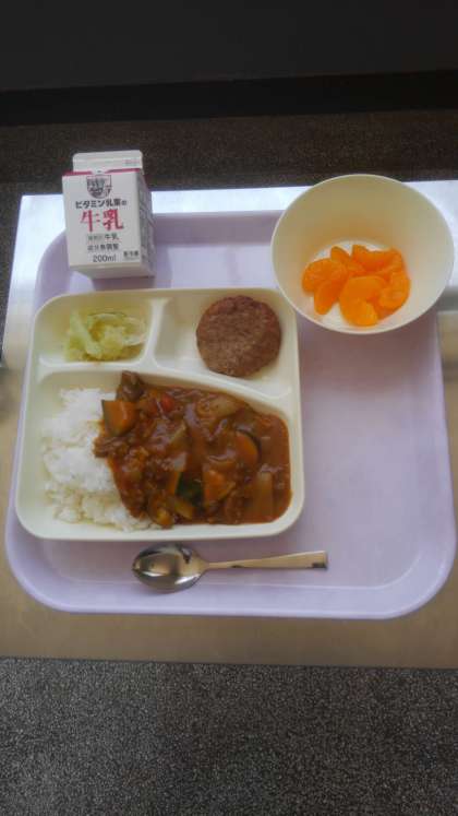 今日の献立は、夏野菜のカレーライス、焼きハンバーグ、キャベツのサラダ、みかん(缶)、牛乳です。