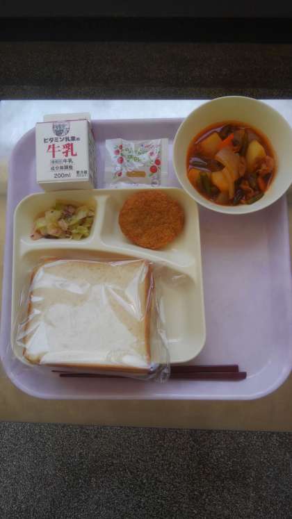 今日の献立は、チキンレバーカツ、ケチャップ煮、たことキャベツのソテー、りんごジャム、食パン、牛乳です。