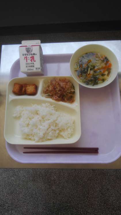 今日の献立は、ゴーヤチャンプルー、すまし汁、あつあげのしょうがじょうゆかけ、ごはん、牛乳です。