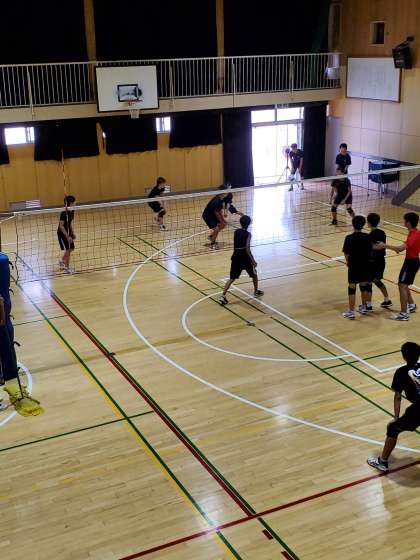 男女バレーボール部がコート2面を使って練習していました。男女とも、天満中学校と瓜破西中学校が来てくれてゲーム形式の練習をしていました。