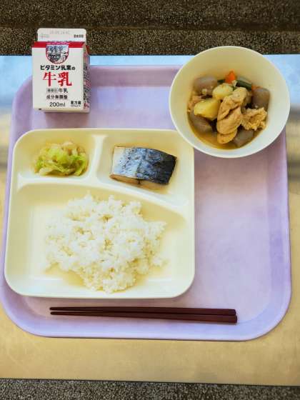 今日の献立は、さごしの塩焼き、じゃがいもと一口がんもの煮もの、キャベツのおひたし、ごはん、牛乳です。