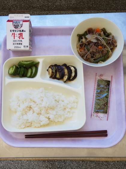 今日の献立は、肉じやが、焼きなすのみそだれかけ、あっさりきゅうり、焼きのり、ごはん、牛乳です。