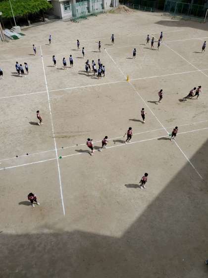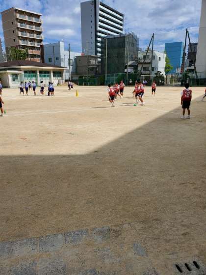 1、2年生の体育の授業でバトン渡しの練習をしていました。