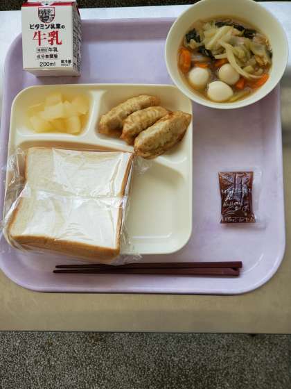 今日の献立は、あげぎょうざ、中華煮、和なし(カット缶)、食パン、いちごジャム、牛乳です。