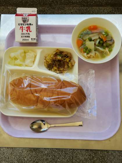 今日の献立は、豚肉のカレー風味焼き、スープ煮、サワーキャベツ、黒糖パン、牛乳です。