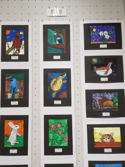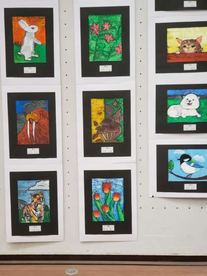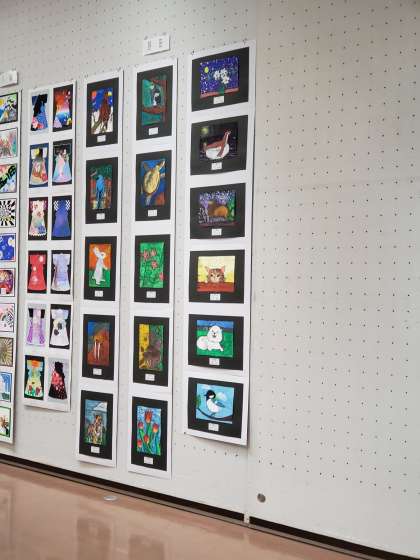 野田中学校からは、授業で取り組んだ2年生の作品が展示されていました。週1時間の美術の授業ですが、本校の作品も他校の作品も力作が披露されていました。
