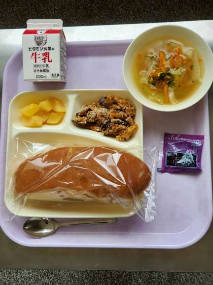 今日の献立は、なすのミートグラタン、鶏肉と野菜のスープ、白桃、ブルーベリージャム、コッペパン、牛乳です。