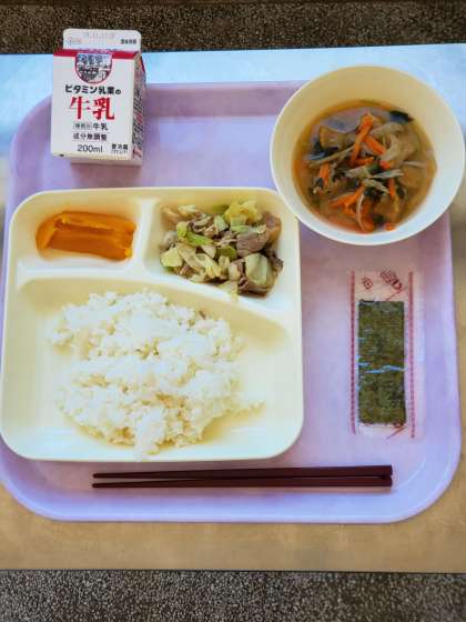 今日の給食は、豚肉とまいたけのいためもの、つみれ汁、かぼちゃういろう、焼きのり、ごはん、牛乳です。