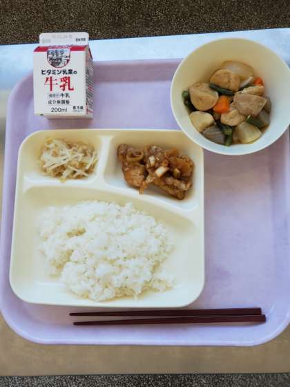 今日の献立は、あげどりのねぎだれかけ、含め煮、もやしのゆずの香あえ、ごはん、牛乳です。