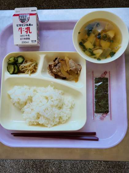 今日の献立は、焼き肉、五目汁、きゅうりともやしのおひたし、焼きのり、ごはん、牛乳です。
