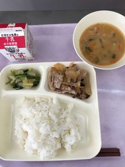 今日の献立は、豚肉のしょうが焼き、さつまいものみそ汁、菊菜と白菜のごま和え、ごはん、牛乳です。