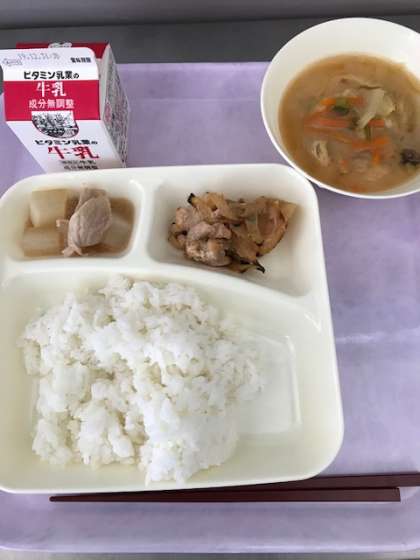 今日の献立は、鶏肉の甘辛焼き、みそ汁、だいこんの煮もの、ごはん、牛乳です。
