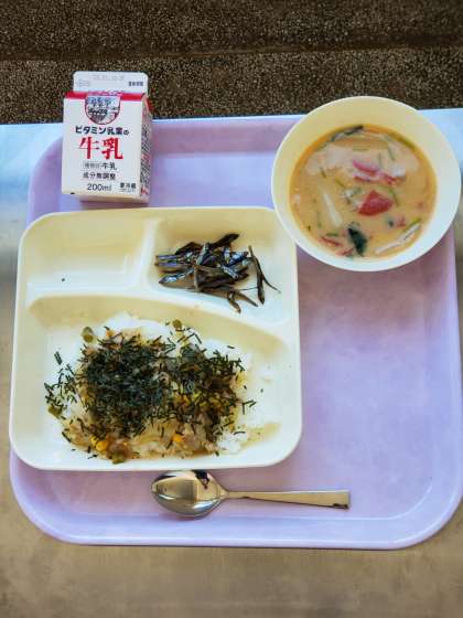 今日の献立は、れんこんのちらしずし、雑煮、ごまめ、牛乳です。