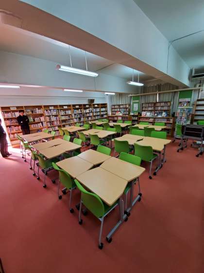 これまでは、大きな机でしたが、個別の机、椅子で、机は台形なので、いろいろなレイアウトができます。