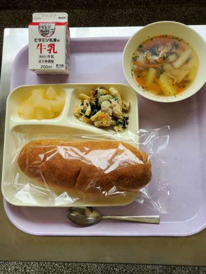 今日の献立は、マカロニグラタン、だいこんのスープ、和なし(カット缶)、ライ麦パン、牛乳です。