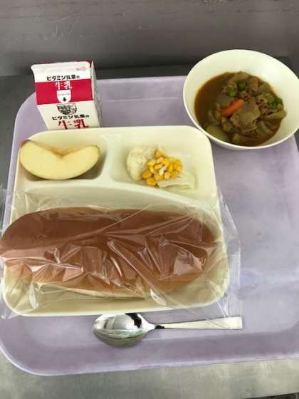 今日の献立は、豚肉と野菜のカレー煮、カリフラワーとコーンのサラダ、りんご、黒糖パン、牛乳です。