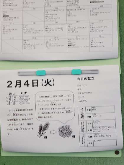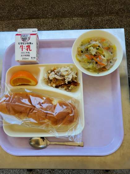 今日の献立は、押麦のグラタン、スープ、いよかん、おさつパン、牛乳です。