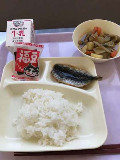 今日の献立は、節分メニューで、いわしのしょうがしょうゆがけ、含め煮、いり大豆、ごはん、牛乳です。