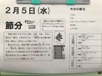 今日の給食カレンダーには、節分について書かれています。病気や悪い出来事を追い払うために豆まきをしたり、鬼が苦手ないわしの頭をヒイラギの枝に刺して、家の入り口に立てる習慣があります。