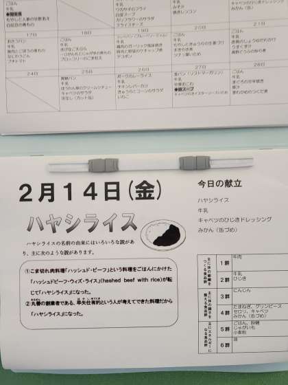 今日の献立は、ハヤシライス、キャベツのひじきドレッシング、みかん(缶)、牛乳です。