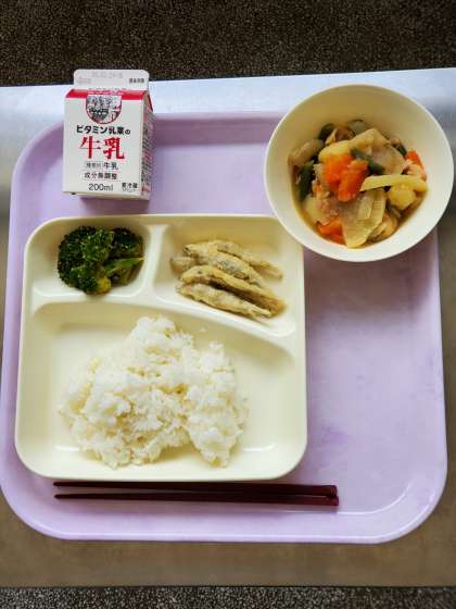 今日の献立は、きびなご天ぷら、一口がんもとじゃがいもの煮もの、ブロッコリーのごまあえ、ごはん、牛乳です。