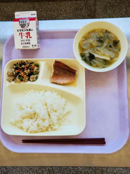 今日の献立は、あかうおのしょうゆだれかけ、うすくず汁、高野どうふのいり煮、ごはん、牛乳です。