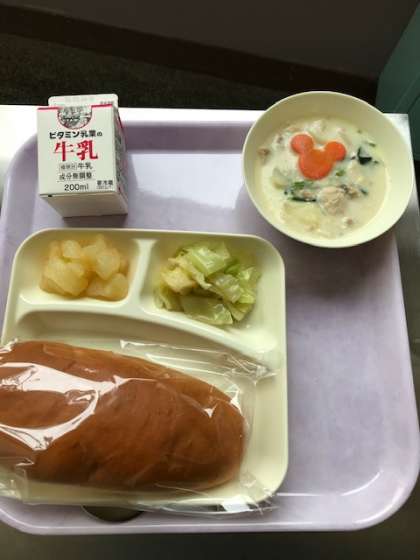 今日の献立は、ほうれんそうのクリームシチュー、キャベツのサラダ、洋なし(カット缶)、こくとうパン、牛乳です。