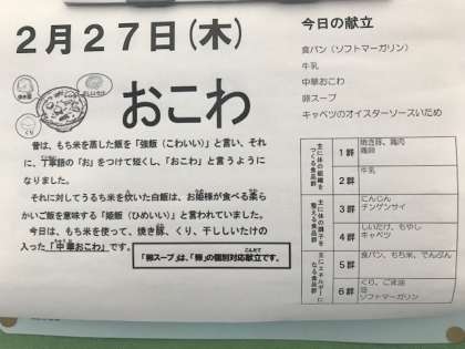 給食カレンダーには、おこわについて書かれています。もち米を用いた料理で、食感も柔らかい中に、粘り気もしっかりあります。しっかり食べて、粘り強く元気に過ごしてほしいと思います。