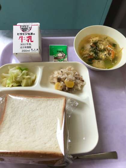 今日の献立は、中華おこわ、卵スープ、キャベツのオイスターソースいため、ソフトマーガリン、食パン、牛乳です。